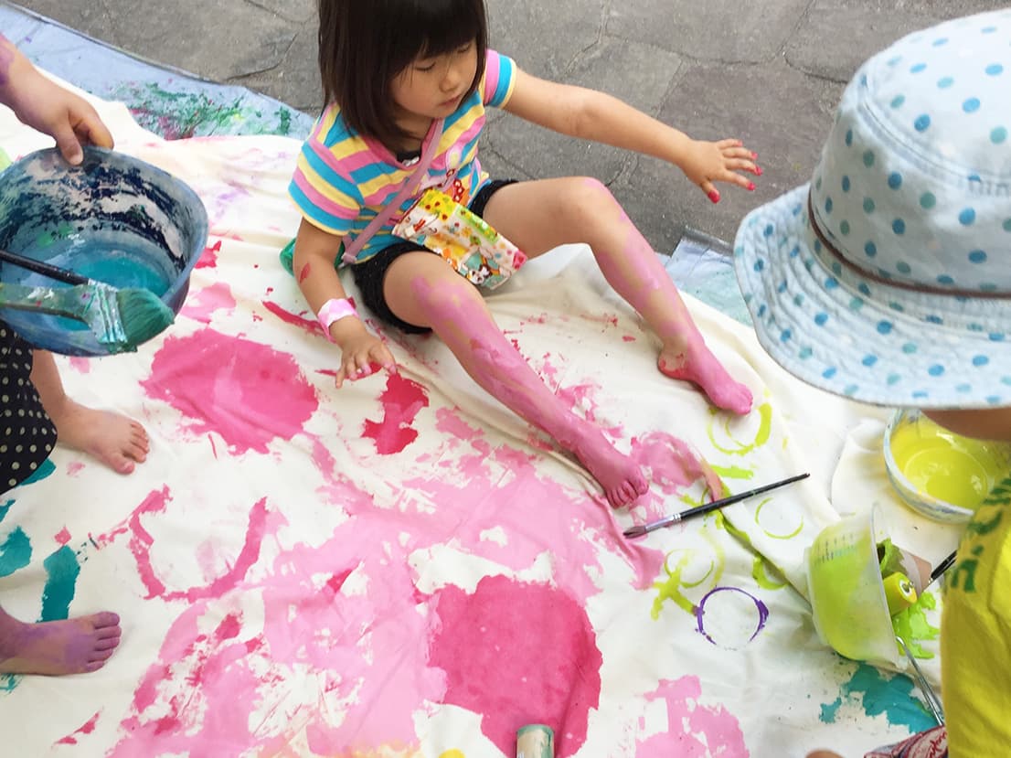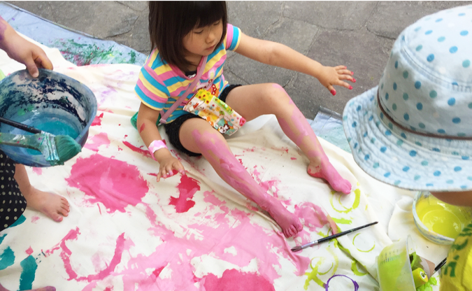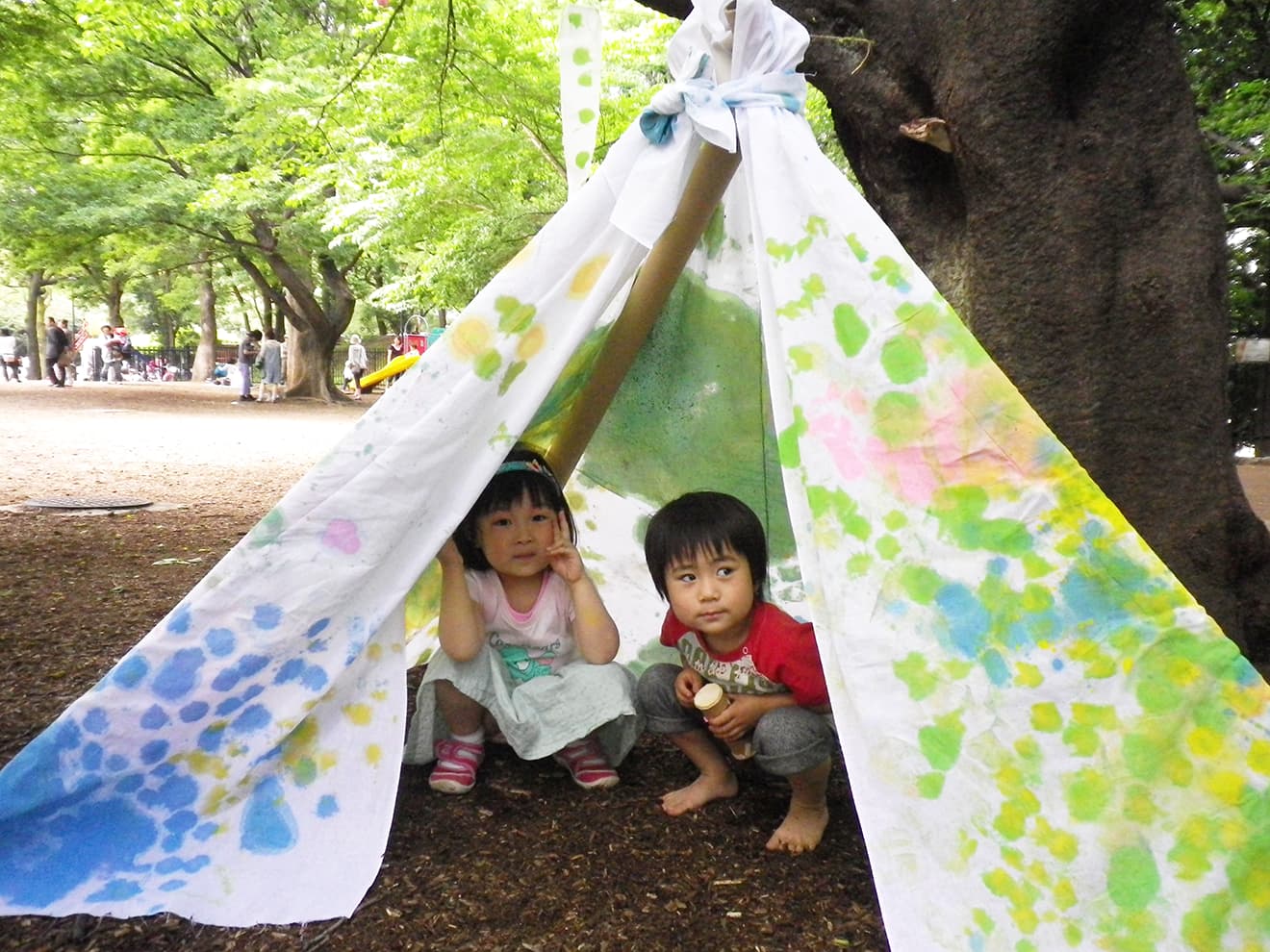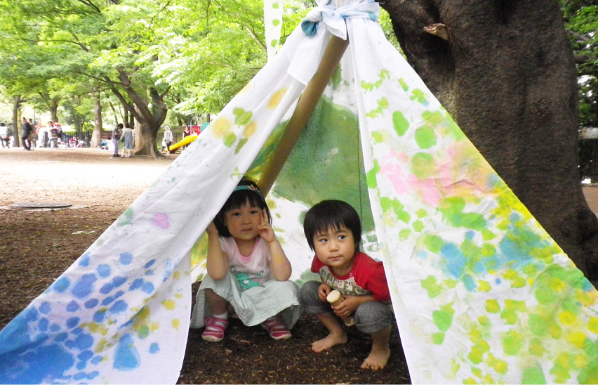 大きな布に自由にダイナミックにお絵描きしちゃおう!お絵描きの後は4本の棒を使ってテントにしたり、バッグにして参加者に配ったりとイベントに合わせて様々です。
