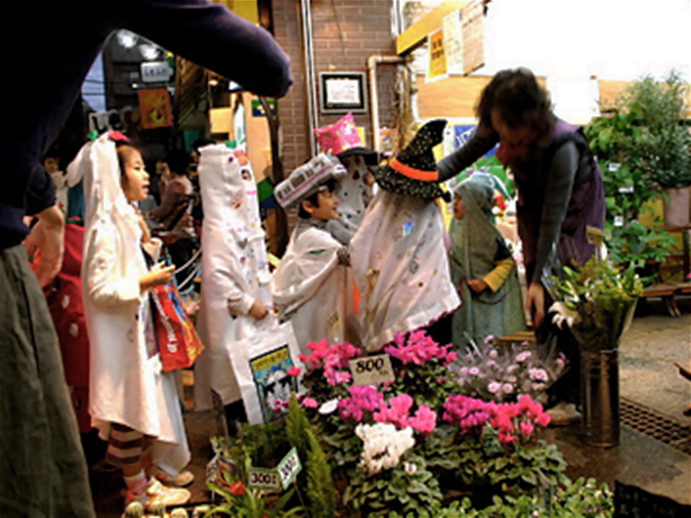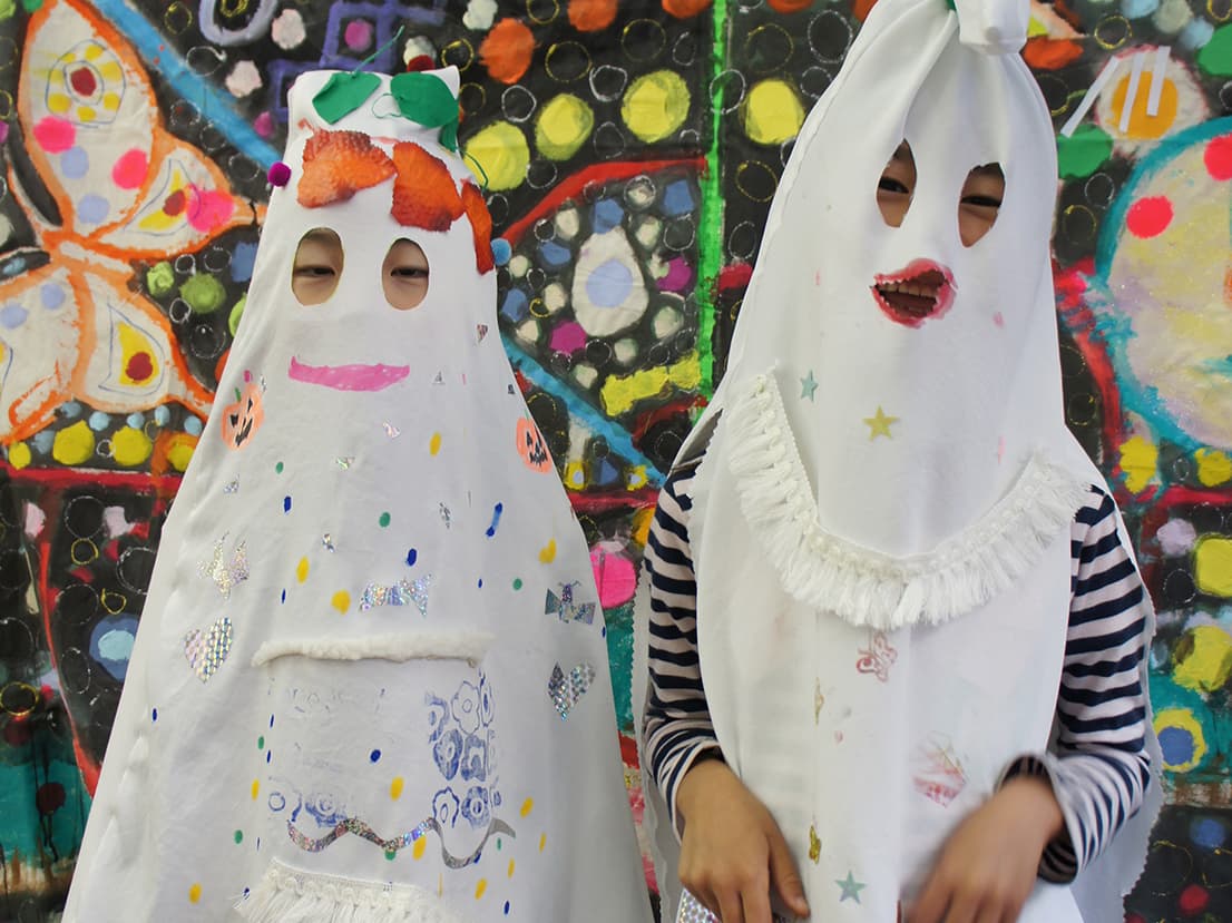 ハロウィンの時期に人気のおばけに変身するワークショップです。一枚の布袋を切ったり、描いたり、むすんだり。様々な素材を切ったり貼ったりしながらおばけを作ります。